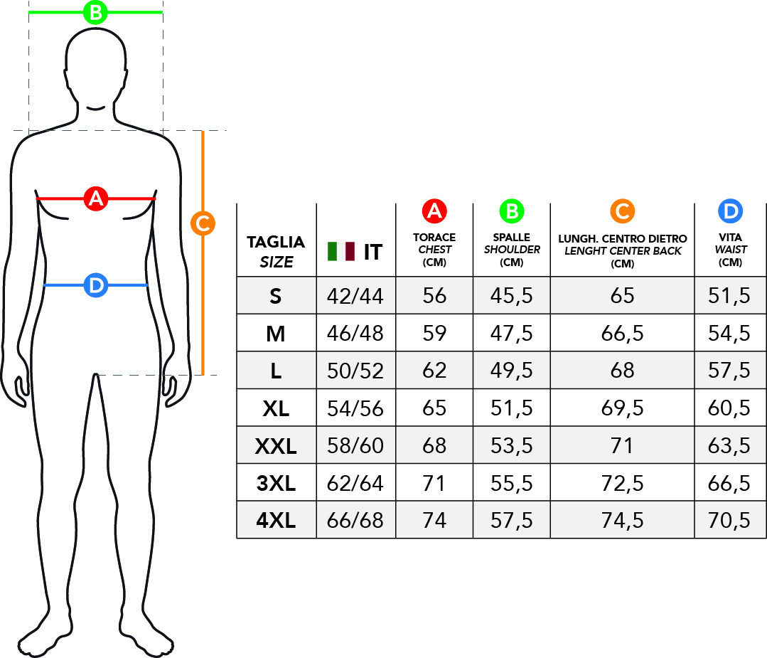 - Collo in piedi - Chiusura davanti con zip - Chiusura tasche vita e tasca petto con zip - Cappuccio staccabile con regolazione - Fondo con regolazione - Polsi con bottoni ed elastico - Logo GRANCHIO applicato su manica sinistra