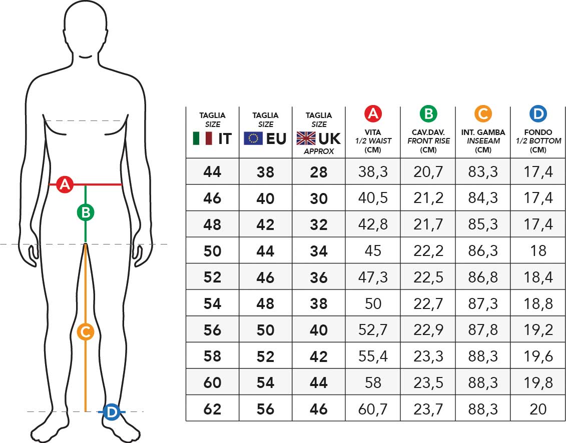 CUSTOM FIT Il modello CREOLA e' un pantalone chinos con vestibilita' modern -Tessuto twill misto lino tinto filo stretch -Tasca dietro con filetto doppio -Tasca davanti a chinos -Interno fodera fantasia -Etichetta dietro logata Il Granchio